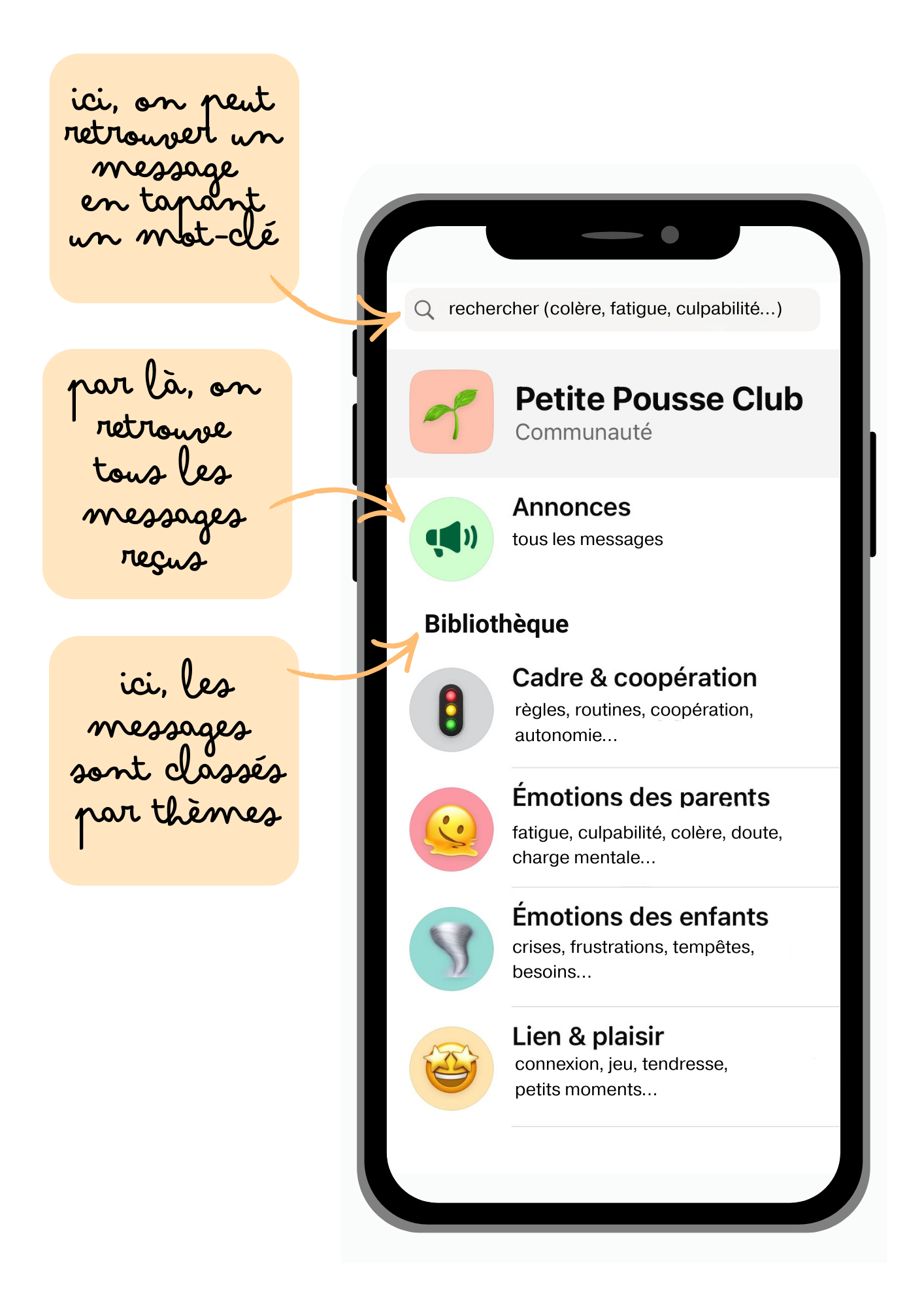 Aucun souci ! Les messages restent disponibles tout le temps de votre abonnement. Chacun.e les lit à son rythme. L'objectif est de se sentir soutenu.e, pas stressé.e. Et puis, vous pouvez retrouver facilement un message grâce à la bibliothèque et à la recherche par mots-clés.